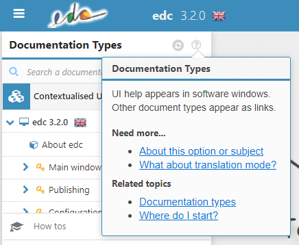 Lorsque l’utilisateur clique sur l’icône, un panel temporaire contenant de l’information s’ouvre. Cette information est ciblée pour répondre aux questions les plus communes lors de l’utilisation du morceau d’interface concerné. Dans ce cas précis, les questions sont “Pourquoi y a t-il plusieurs types de documentation ? Lequel choisir ?” (ceci reflète mon expérience générale, la plupart des questions de base sont une variation de “Qu’est-ce que ça fait ?” ou de “Comment faire X ?”, peu importe le logiciel).